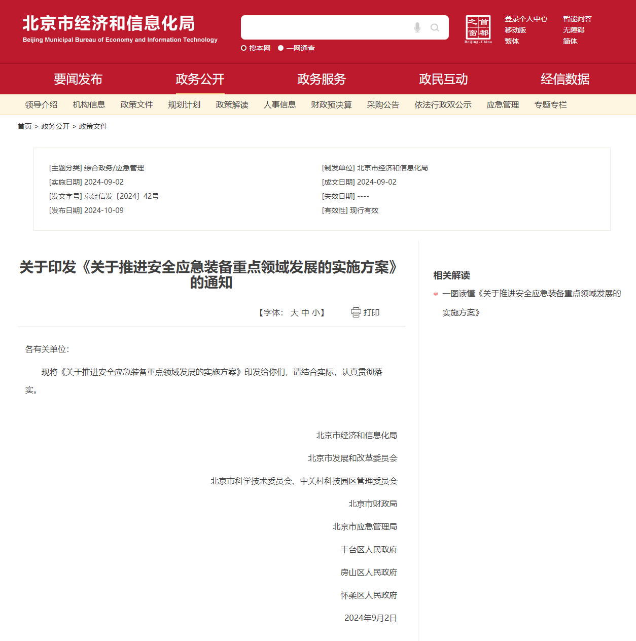 近日,北京市经信局等部门发布《关于推进安全应急装备重点领域发展的实施方案》。《方案》提出,力争到2025年,以创建国家安全应急产业示范基地为契机,培育3—4个安全应急产业聚集区,打造新媒体安全应急知识输出及产品销售平台,合力构建京津冀地区安全应急装备先进制造业集群。